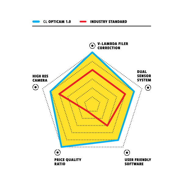 Bestaande klanten in de elektronicasectoren voor auto’s en huishoudelijke apparaten hebben de aanzet gegeven tot de ontwikkeling van het GL OPTICAM beeldhelderheidssysteem. Voor efficiënte en betrouwbare componententests tijdens inkomende QC, ontwikkeling en productietests hadden ze een camerasysteem nodig dat zowel gemakkelijk toegankelijk als betrouwbaar was. Het werd al snel duidelijk dat veel andere klanten die te maken hebben met op LED’s gebaseerde verlichtingsproducten ook hetzelfde systeem nodig hadden, wat vraagt om handige en gebruiksvriendelijke apparatuur voor helderheidsmetingen, zowel intern als op locatie. De nieuwe Sony CMOS monochromatische beeldsensor, samen met ons V-lambda klasse A correctiefilter en een zorgvuldig gekozen lens voor multifunctionele luminantietests en -metingen, dienden als basis voor de bouw van GL OPTICAM 1.0. Dit instrument is een handig hulpmiddel dat overal kan worden gebruikt met behoud van laboratoriumprecisie en -prestaties dankzij de kleine behuizing.
