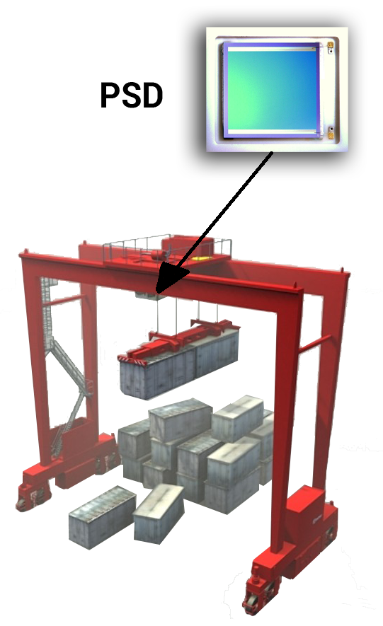 Een sensor die een PSD (Position Sensing Detector) gebruikt, is gemonteerd op de trolley van de hijskraan. Deze sensor detecteert de x- en y-positie van een baken op de haak (of haken) waaraan de container hangt. De verplaatsing van de lading wordt opgenomen in het uitgangssignaal van de sensor. Dankzij de snelle reactie van de PSD is het mogelijk om via terugkoppeling, de zwaai direct te corrigeren.