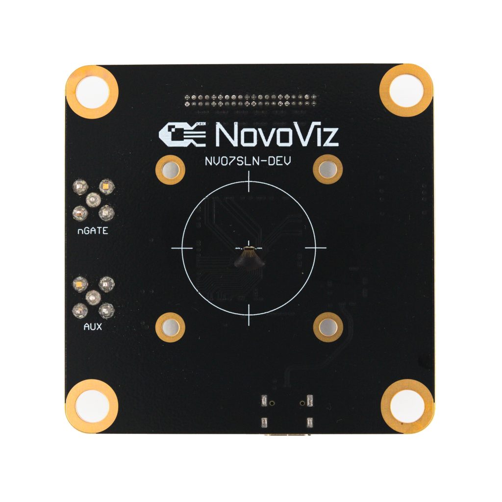 The NovoViz NV07SLN-DEV requiring single photon line detectors with low timing jitter. The device does not require any external threshold circuitry and provides an asynchronous digital output for every pixel. Accumulated counts are read over the single USB connection that also provides power.